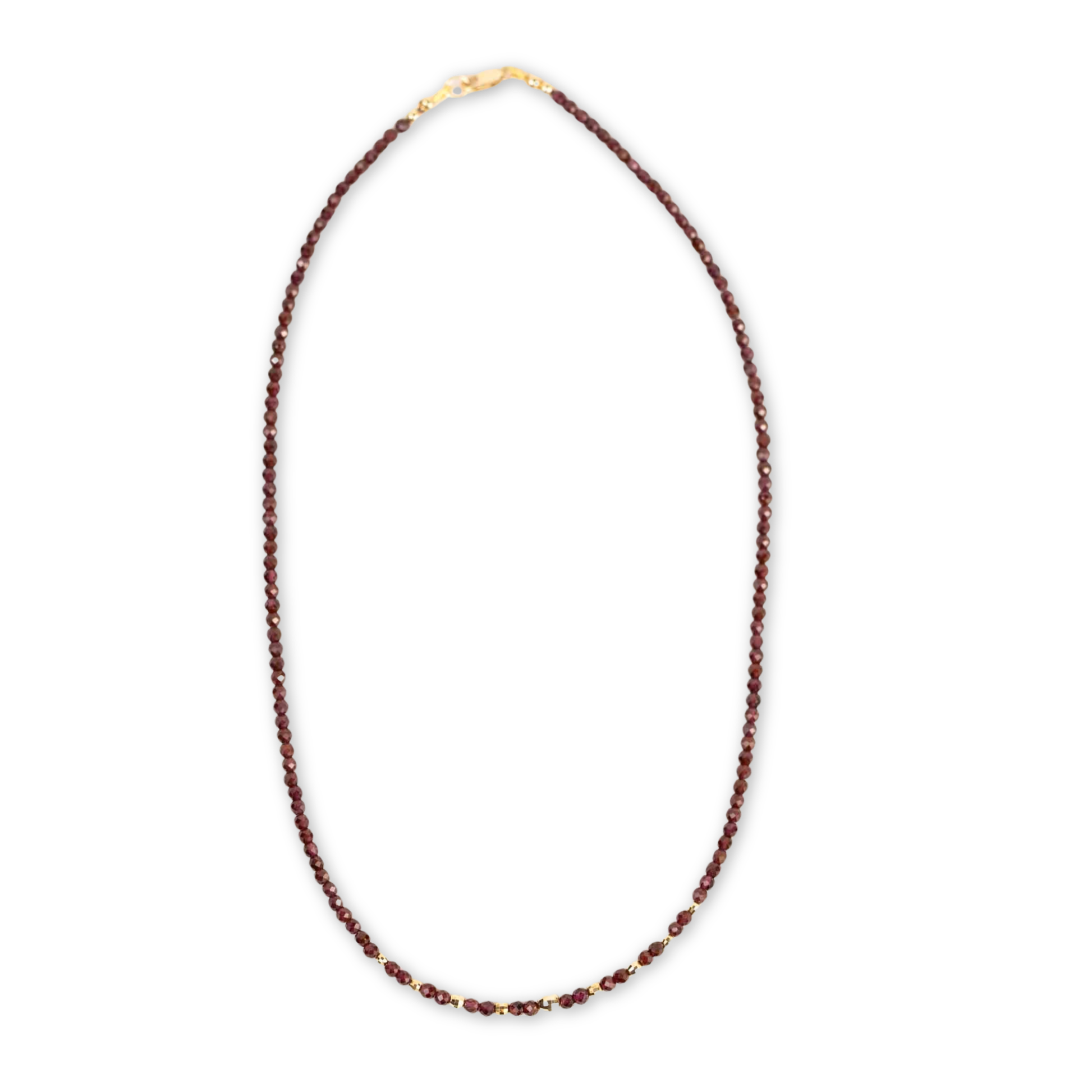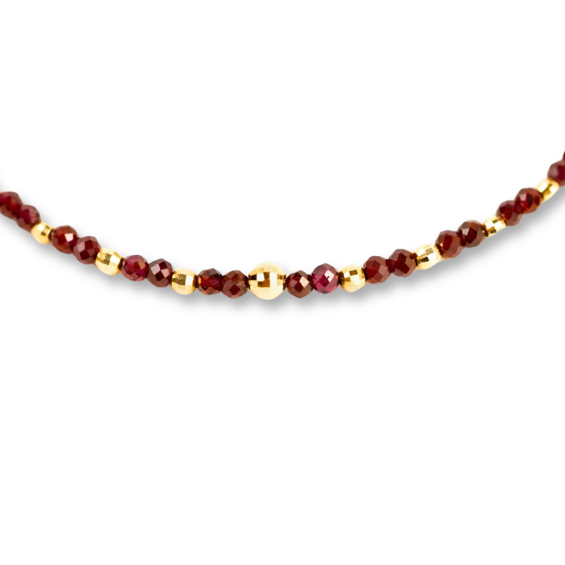 Shine brightly in this sparkling faceted garnet and 14K gold mirror bead necklace. 16" with lobster closure.