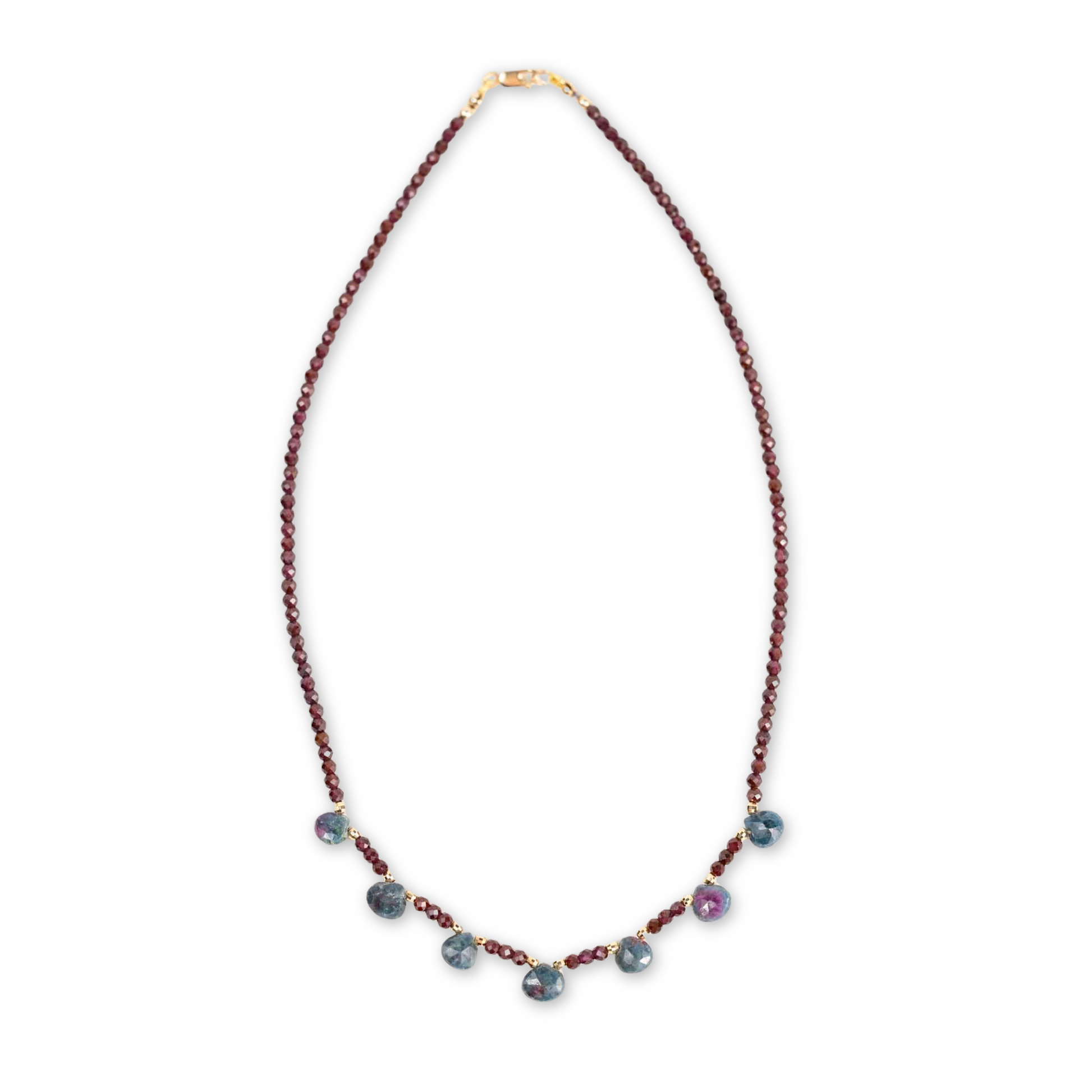 This very merry garnet necklace is enhanced with faceted hearts of green and burgundy ruby zoisite. What a festive addition to your holiday wardrobe! 16" with lobster closure.