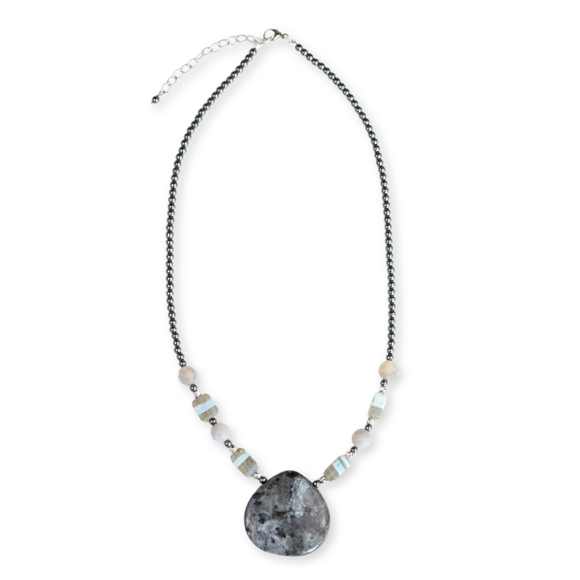 A shimmering panel of black labradorite is combined with blue lace opal, grey agate and hematite to create this statement piece. Rhodium plated sterling silver nuggets highlight the design. Lobster closure. 17" plus 2" extender.