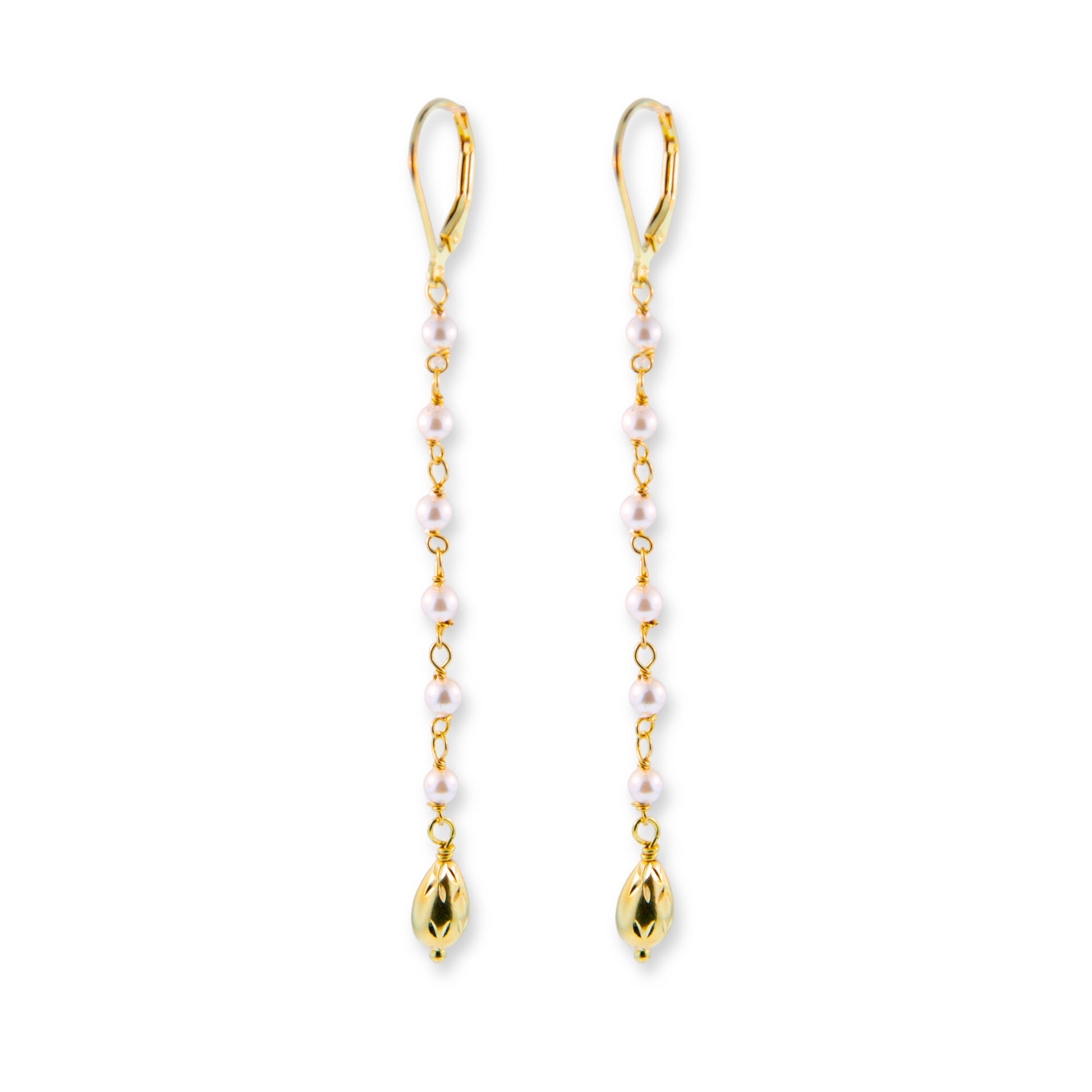 A distinctive etched gold over sterling teardrop is the crowning glory of this white wrapped pearl shoulder duster earring. 3" drop.