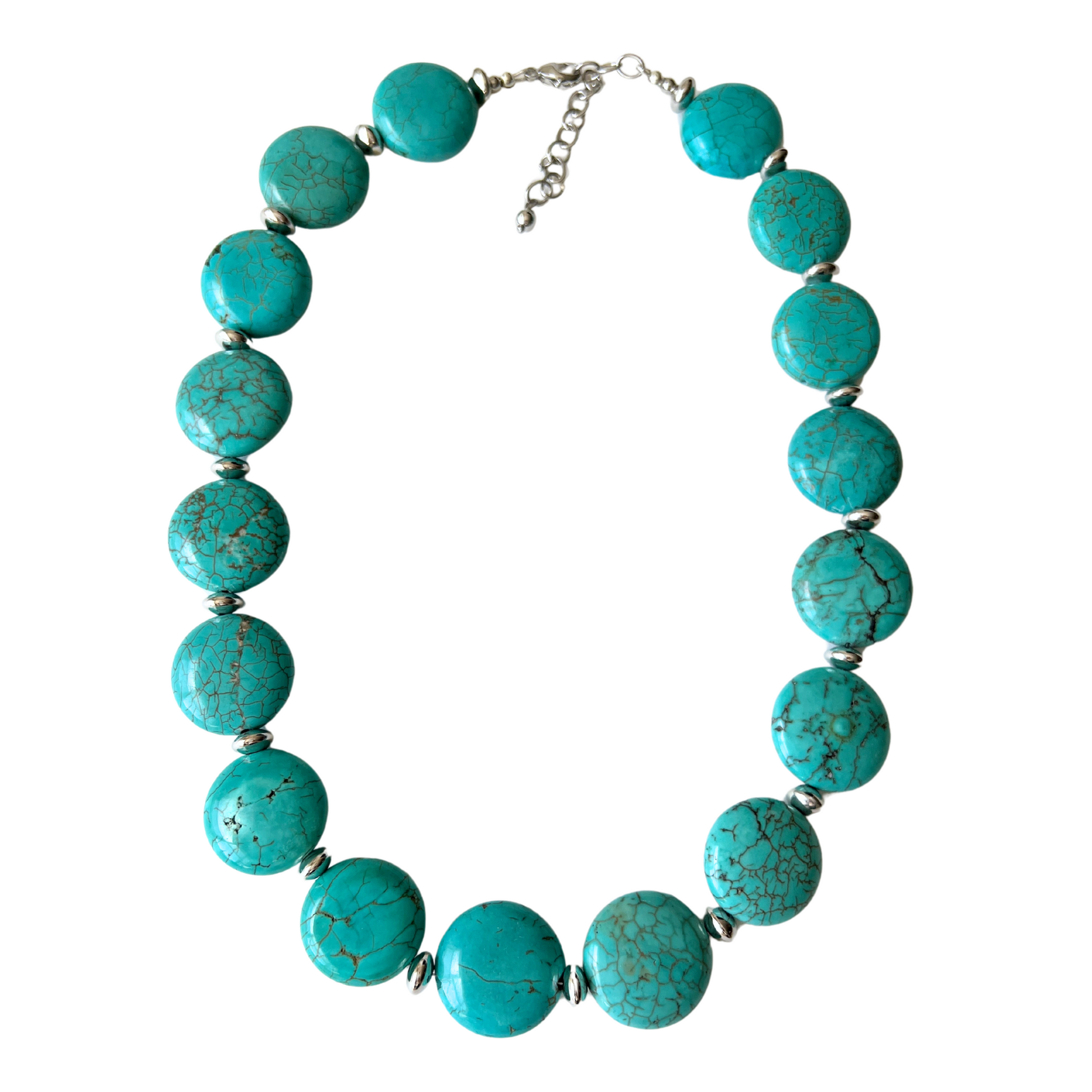 Alternating 20mm turquoise coins and rhodim plated sterling silver saucers comprise this timeless necklace. 17" with 2" extender and lobster closure.